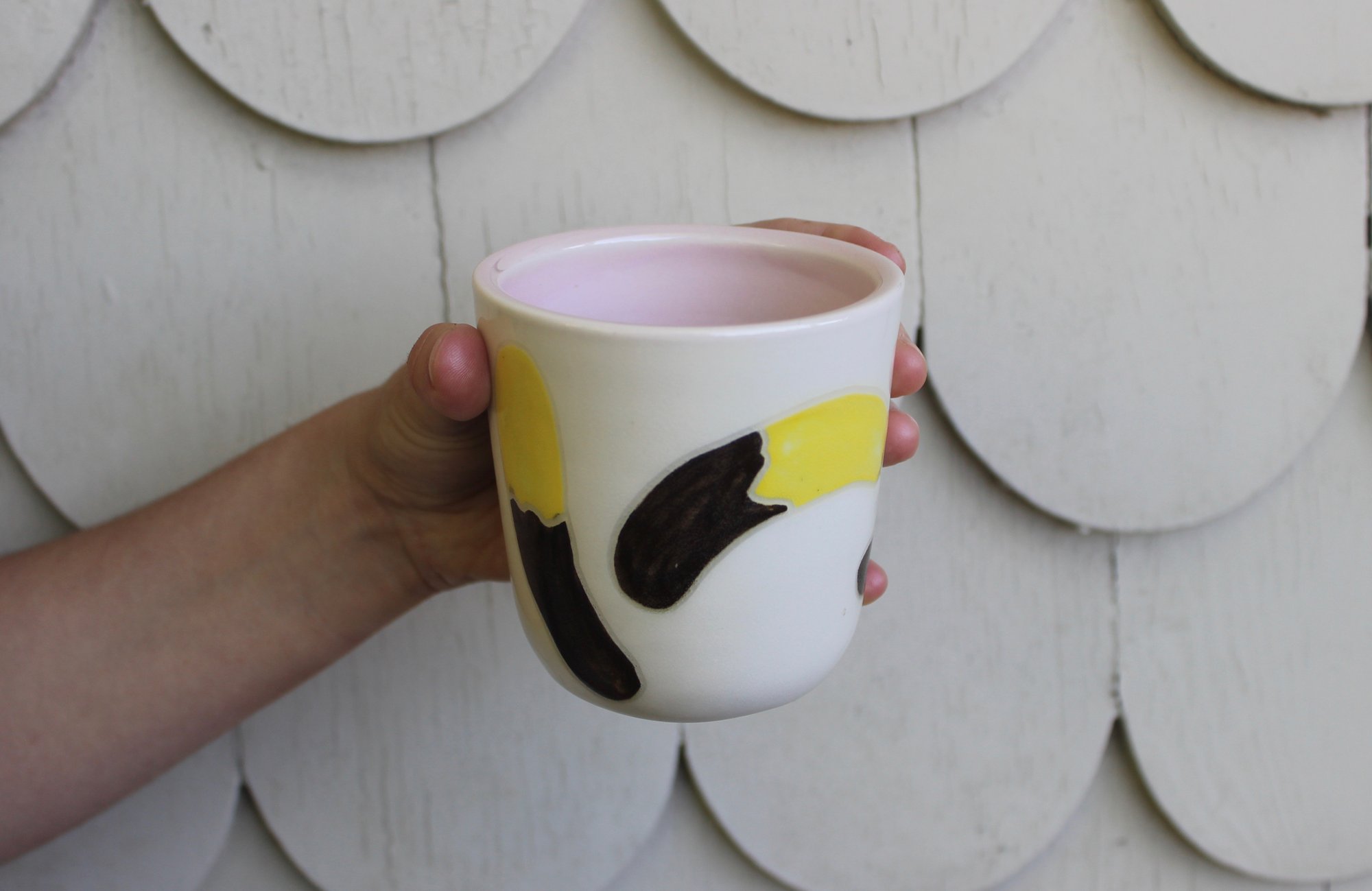 Porcelain cup with carving. Drawings go all the way around the cup. Food safe. Dishwasher safe. Holds ~9oz.