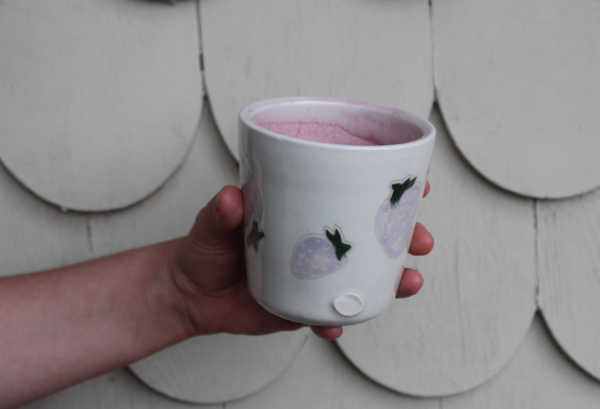 Porcelain cup with carving. Drawings go all the way around the cup. Food safe. Dishwasher safe. Holds ~12oz.